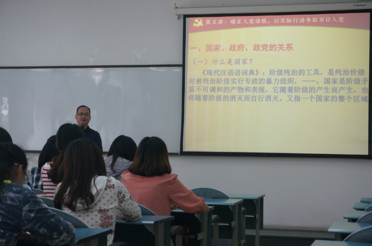 樊老师从国家、政府、政党之间的关系出发,分三个方面详细阐述了“政府的权力来源于人民”的观点:1.国家之于领土、人民、民族文化的意义;2.政府的基本性质以及权力来源;3.政党执政的合法性。他以党章总纲作为基础,引出了作为一名合格的共产党员所必须具备的品质,即“有共产主义觉悟的先锋战士”等。他指出大学生入党积极分子应该认真学习党的光辉历史,党的章程,明确自身对党的认识,端正入党动机。