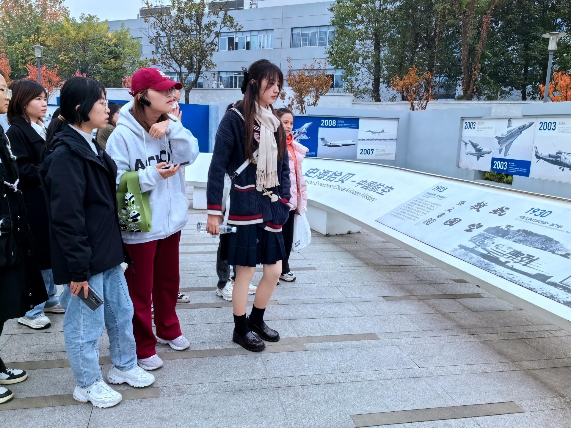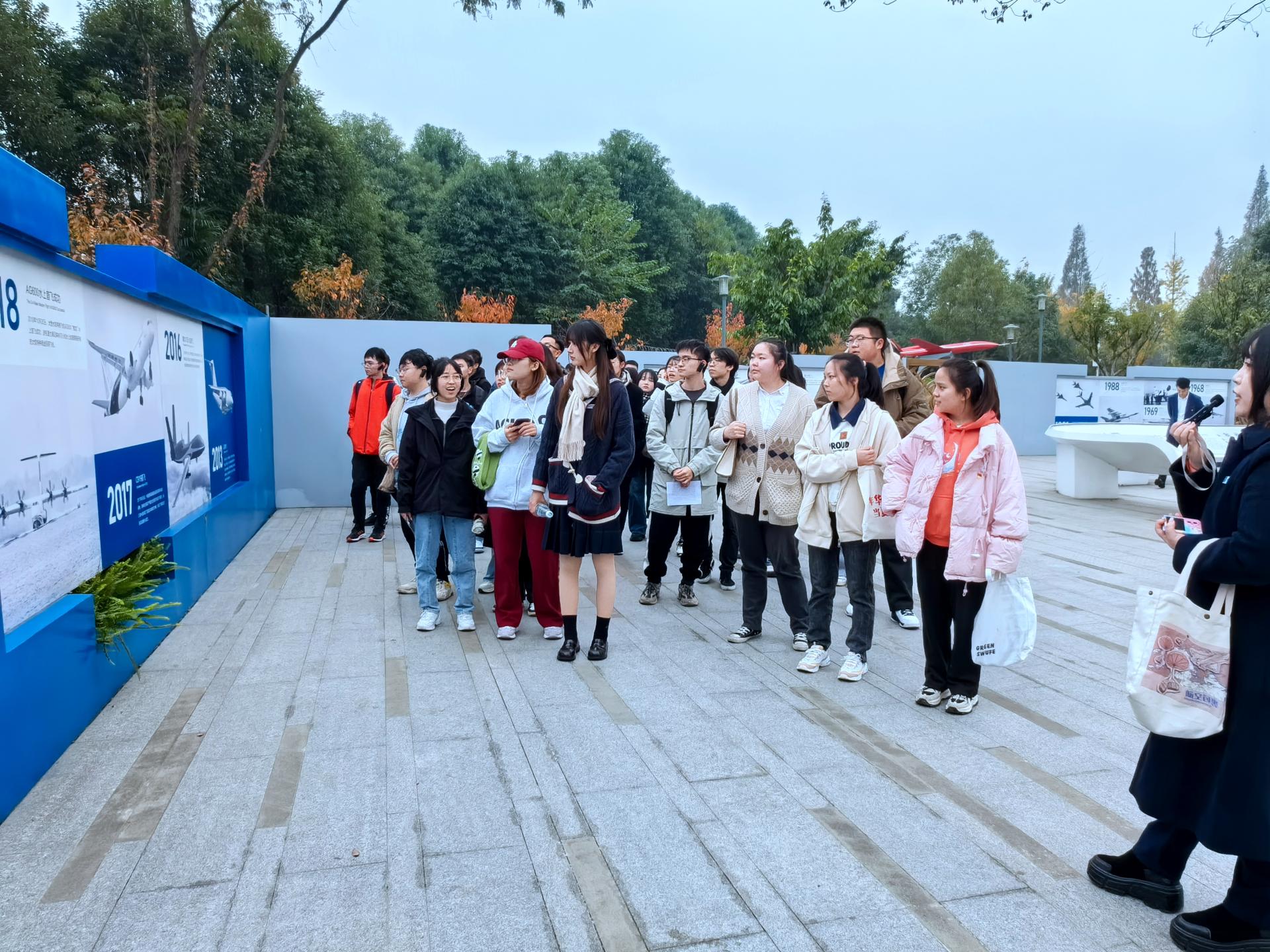 来到成飞公园航空主题教育基地,全体同学紧跟基地讲解员的步伐,依次参观了威龙广场、航空史迹、铁翼风华、龙腾广场、航空问道、航空拾趣6大片区,观看了歼-5、歼-7、枭龙、歼-10、歼-20等各式各样的真机和样机,了解飞机的研制流程、制作工艺及相关零部件等,深刻感悟了航空科学家们实事求是、严谨认真、一丝不苟、精益求精的科研精神,真切感受到中国战斗机研制从无到有、从弱到强的艰辛历程,深刻认识到科技创新在提升国防实力和综合国力方面的重要战略支撑作用。