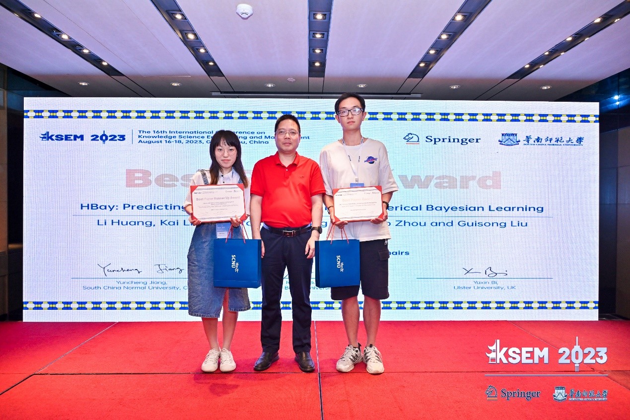 成果四:由新财经综合实验室黄鹂老师、高强副教授(通讯)、刘贵松教授共同指导的2022级计算机软件与理论专业硕士研究生刘铠研究论文“HBay: Predicting Human Mobility via Hyperspherical Bayesian Learning”获得KSEM 2023大会唯一Best Paper Award。该奖项是KSEM组委会对当年接收的长文(full paper)授予的最高奖项,由审稿人提名,主席根据贡献度、完成度以及影响力进行综合评价。针对POI预测问题,该论文提出了一种使用超球模型的预训练与微调相结合的推理方法HBay。HBay首先通过图学习的方式来挖掘轨迹背后的多种上下文交互语义。其次,通过超球变分贝叶斯推理设计了概率轨迹生成的预训练模型,通过自监督训练去学习兴趣点之间的时空关系。最后,在预训练的基础上通过微调与历史轨迹的注意力提取,实现了对下一个兴趣点的精准预测。