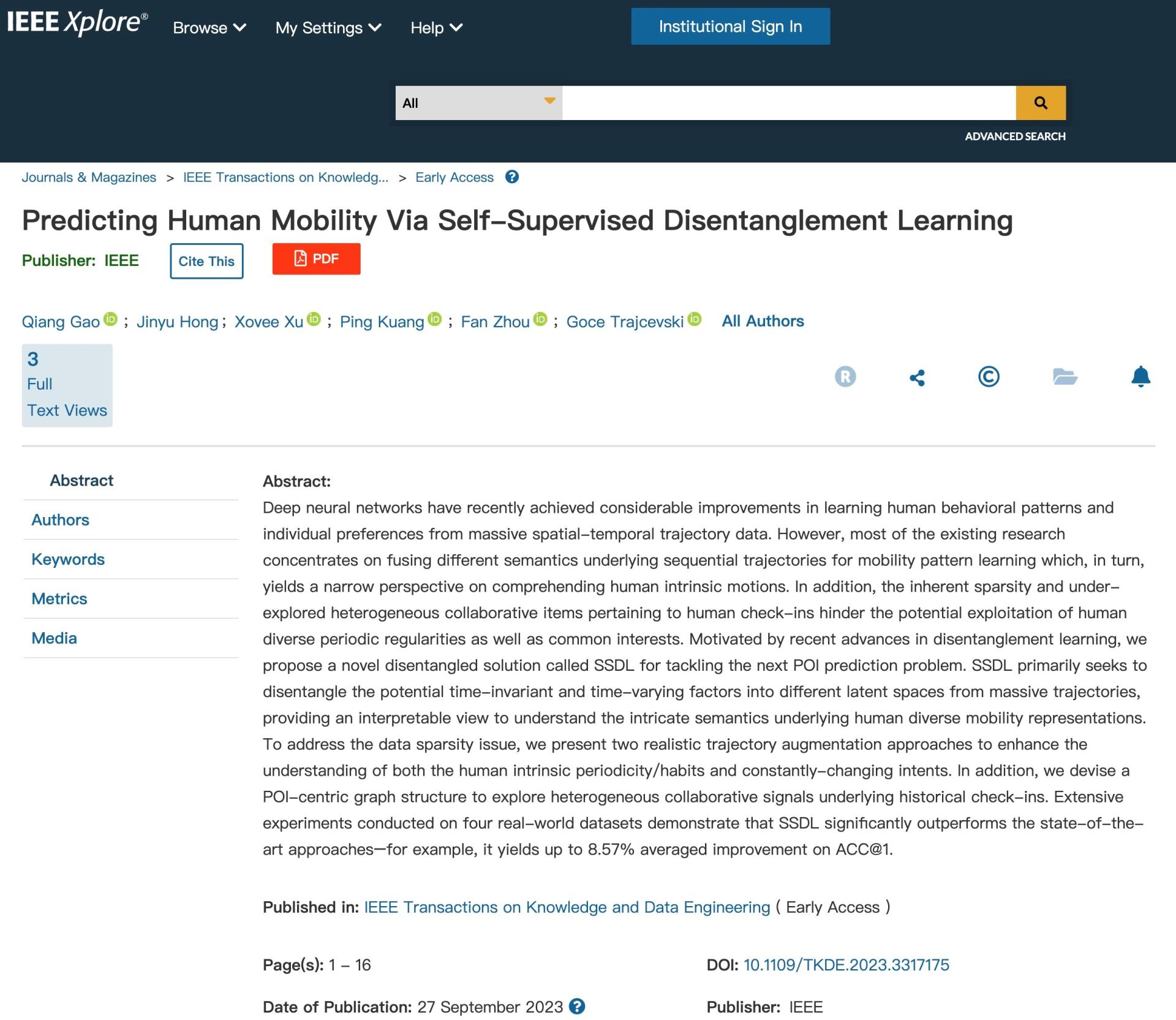 成果二:以高强副教授为第一作者,ylzz总站线路检测中心为第一单位的研究论文“Predicting Human Mobility via Self-supervised Disentanglement Learning”被IEEE Transactions on Knowledge and Data Engineering(IEEE TKDE)录用,论文提出了SSDL新型解耦表示学习方案用于解决下一个 POI 预测问题。SSDL的主要目的是从海量轨迹中将潜在的时不变因素和时变因素分解到不同的潜在空间中,从而提供一种可解释的视角来理解人类不同移动表征背后错综复杂的语义。