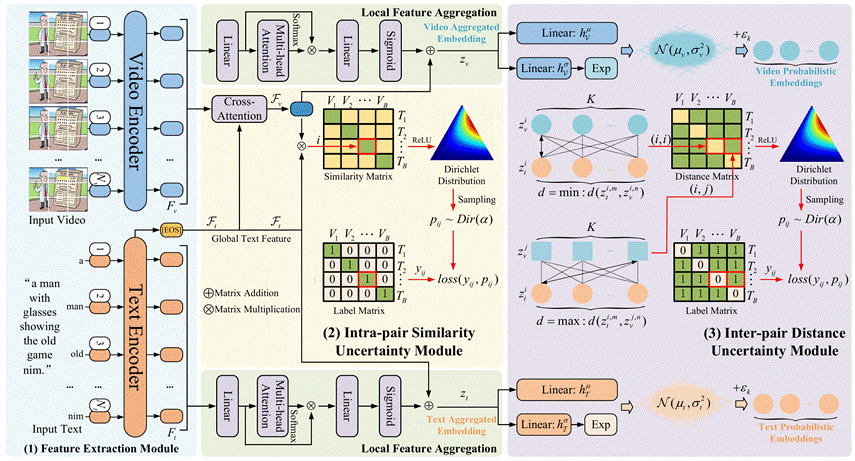 文本视频检索是多模态表征学习中最具影响力的应用之一,它基于文本查询,从海量视频数据中精准查找最相关的视频片段,极大推动了视频内容的传播。然而,单纯依赖文本与视频特征间的相似度来实现检索,往往难以满足实际需求,特别是当查询语句描述不够充分时,检索方法难以精准的检索到相应视频。为解决上述问题,该研究创新性提出了一种双重不确定性量化(DUQ,Dual Uncertainty Quantification)的检索方法,通过对内相似性不确定性模块(ISUM)增强对内多模态特征交互,对间距离不确定性模块(IDUM)增强对间多模态特征排斥,共同改进多模态特征间相似性计算的准确度,极大地提高了检索的精度,在6个文本视频检索基准数据集上测试表明,方法达到了SOTA的性能。