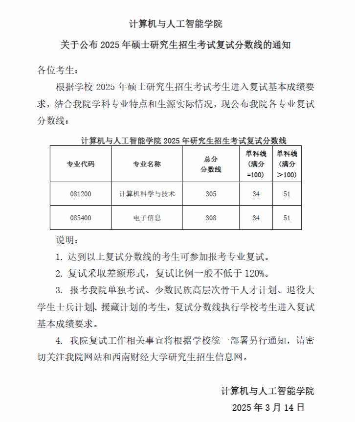 计算机与人工智能学院关于公布2025年硕士研究生招生考试复试分数线的通知