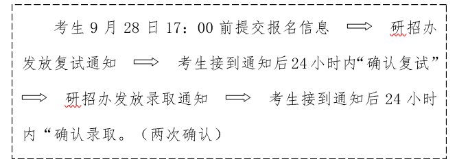 4.获得拟录取资格的申请人务必于9月28日17:00前(预计时间,具体时间另行通知)登陆教育部“全国推荐优秀应届本科毕业生免试攻读研究生信息公开暨管理服务系统”填写并提交报名信息。并按照如下程序完成录取确认,逾期未确认将视为自动放弃录取资格;考生在系统中填报的学院和专业须与公示的拟录取名单一致;