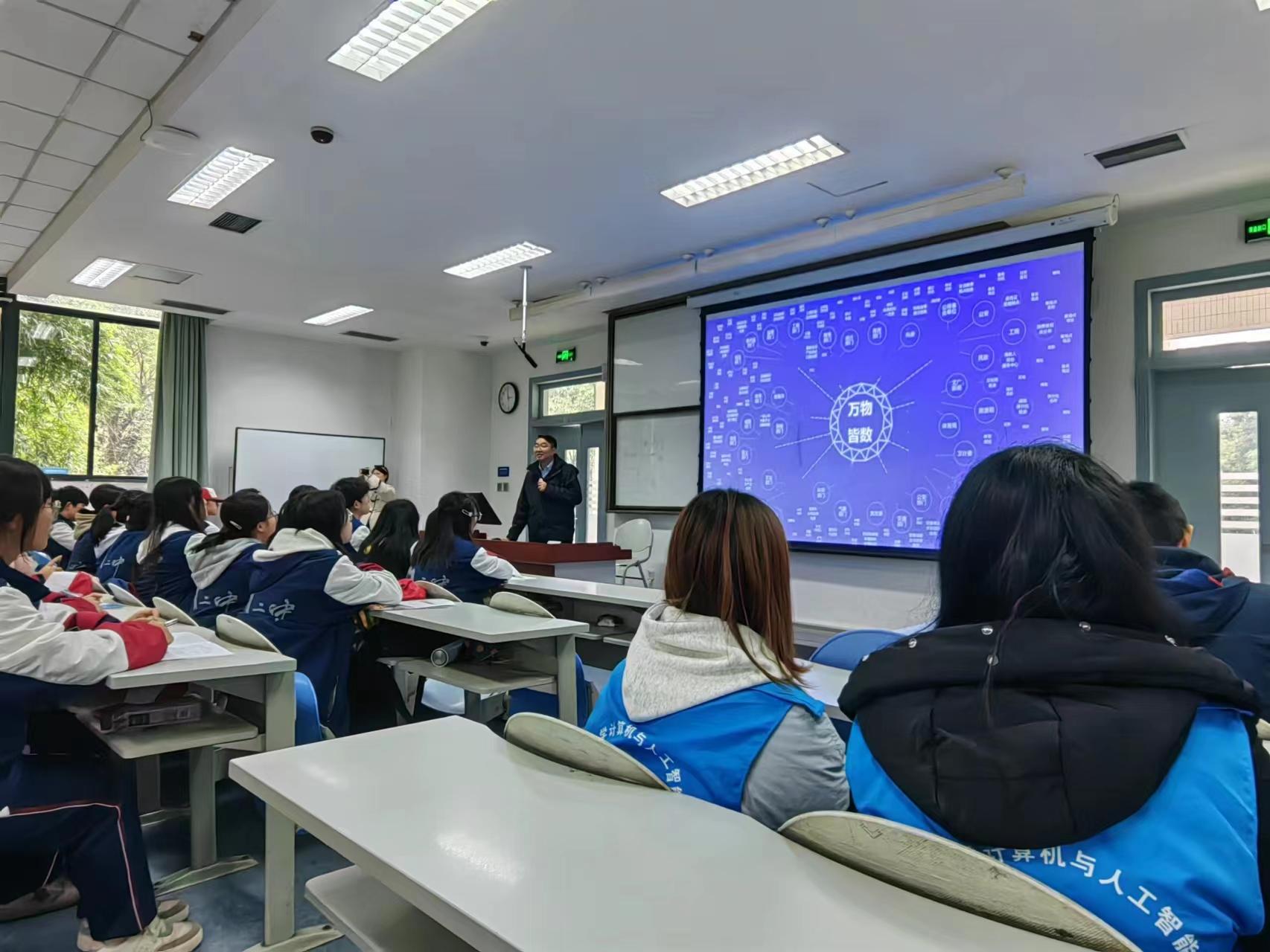 学院与到访师生一行进行了深入交流。学院党委副书记谢奉君代表学校对峨眉二中师生的到访表示热烈欢迎,并介绍了学校学院的发展历程、专业设置和人才培养特色,她表示,此次峨眉二中师生访学活动为两校的合作提供了新的契机,希望双方能够进一步加深了解、促进交流,为未来的合作奠定更加坚实的基础。学院本科生教学指导委员会主任黄迟教授为到访师生开展《大数据技术及应用》的专题讲座,他从大数据、机器学习、深度学习到人工智能和ChatGPT,并结合生活中的案例深入浅出地介绍了大数据技术的最新发展和应用场景。学院2020级本科生高靖宇和欧阳文青分别分享了他们的大学生活,他们从学习、兴趣、实践、科研、升学等维度,用自己的经历鼓励学弟学妹们要勇于尝试、积极学习,不断提升自己的能力。