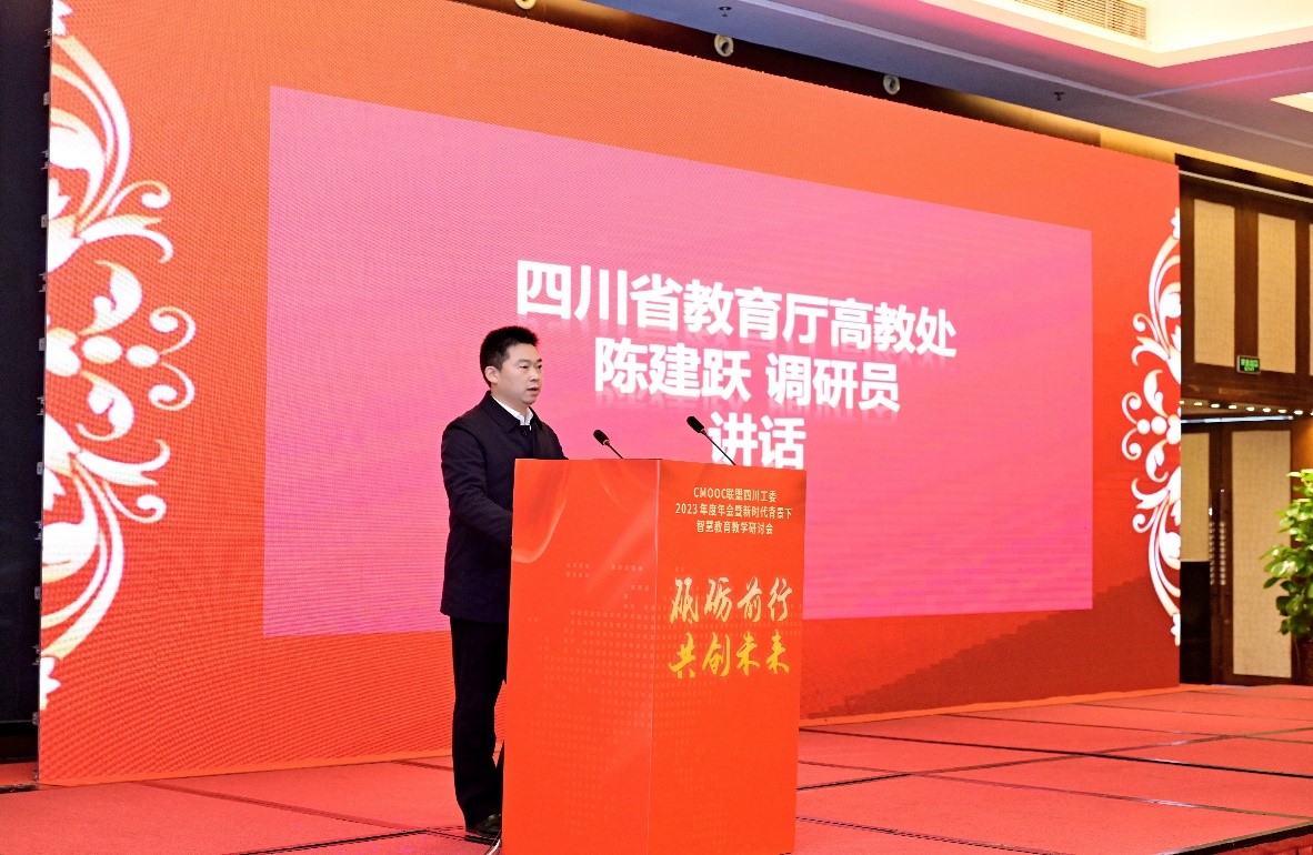 在大会开幕式中,四川省教育厅高教处四级调研员陈建跃出席开幕式并讲话。他提到,四川省教育厅高等教育处肩负四川省本科高等教育教学的宏观管理工作,高等学校教育教学改革、教育质量管理和评价的指导工作。长期以来,教育厅对课程建设、教育教学改革高度重视,评选了一流本科课程、课程思政示范课程、课程思政示范专业等多个项目。最近也刚公布了首批省级课程思政标杆院系和课程思政典型案例,目前正在进行省级高阶课程的遴选工作,第三批国家级一流本科课程的报送也即将启动。