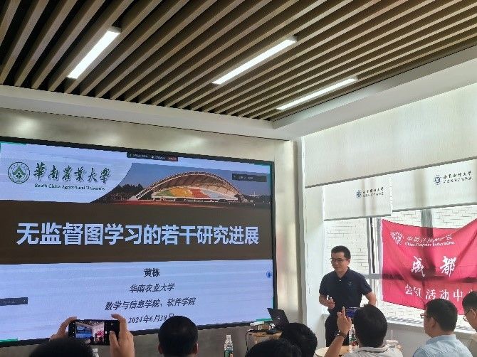 接下来,华南农业大学数学与信息学院副院长黄栋教授和其硕士生刘圣余共同带来了题为《无监督/自监督图学习的若干研究进展》的报告,介绍了图学习作为数据表达的一种基本形式,在反映数据样本间的关联信息方面的重要性。刘圣余则重点分享了他们在大规模二部图单步分割算法、多源大规模图融合学习及其应用等方面的研究成果。