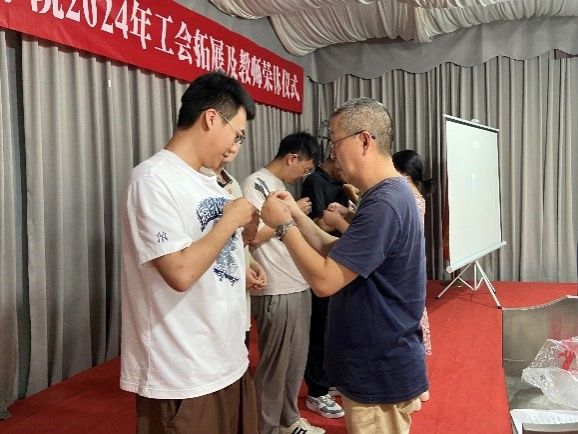 活动中,荣休教师还给新进教师佩戴了校徽。这一仪式不仅象征着精神的传承,也激励着新进教师不忘初心,牢记使命,继续为教育事业奋斗。佩戴上校徽的新进教师们纷纷表示,将不负前辈们的期望,努力成为优秀的教育工作者。