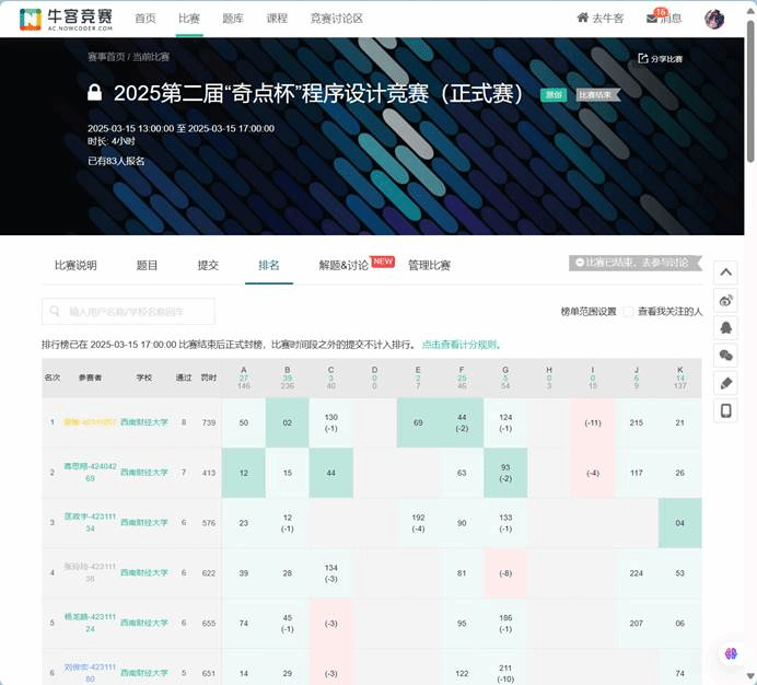 本次竞赛吸引了来自校内13个学院的108名选手及52所高校的290名外校选手同台竞技,线上线下联动,共同呈现了一场高水平的编程盛宴。竞赛采用牛客竞赛平台,现场选手们紧盯屏幕,指尖飞舞。经过4小时激烈角逐,我校6名选手斩获金奖,12人获银奖,19人获铜奖。其中,大一大二年级的优胜者获得丰厚奖金,最快解题奖选手则收获了特色校园文创奖励。