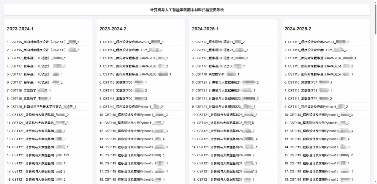 系统开发团队负责人周峰老师介绍,二期系统通过浏览器端网络应用系统的开发,显著提升了用户体验。二期系统的核心突破之一在于解决了传统非电子阅卷试卷的数字化管理难题。过去,教师需手动比对班级名单逐一重命名扫描文档,工作耗时耗力。新系统通过智能识别技术,可自动完成扫描文件的规范化命名,并智能合并同一学生的多页试卷,将复杂的命名操作简化为两次点击,实现了班级、学生、试卷数据的有机整合,工作效率提升显著。另外,针对审核评估工作中档案查阅不便的痛点,二期系统创新推出了在线查阅功能。审核评估专家可通过链接直接访问所需材料,支持浏览器内直接查看PDF及图片格式文件,无需反复拷贝存档。该系统延续了一期对标准格式的良好支持,确保了档案管理的规范统一,同时大幅降低了文件重复存储的管理成本。