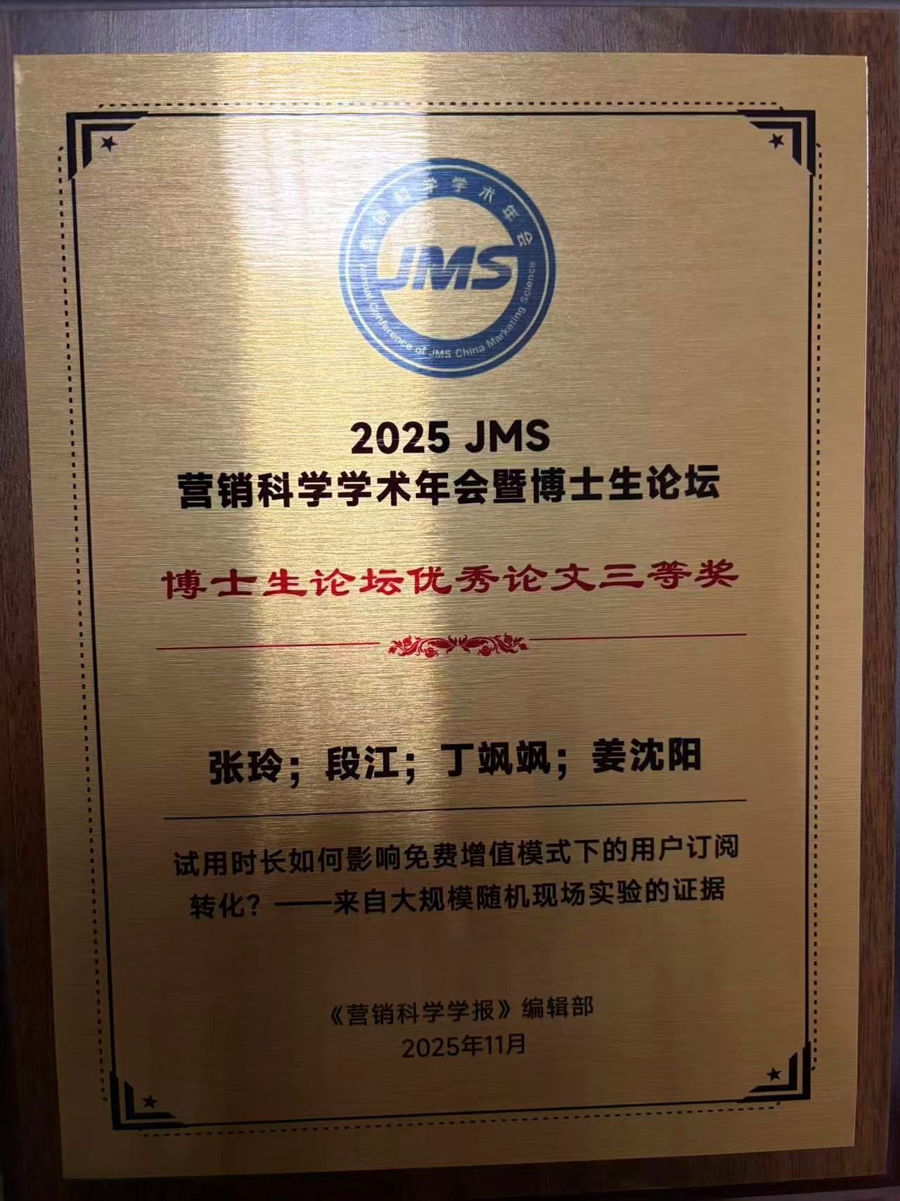 篇获奖论文分别来自北京大学、复旦大学、南京大学、ylzz总站线路检测中心、上海财经大学和香港中文大学,涵盖了人工智能营销、消费者行为、数字化创新与品牌管理等多个前沿领域,充分展示了国内青年学者在科研创新与学术深度方面的卓越表现。在博士生论坛评选环节中,段江教授指导的博士生张玲同学凭借论文《试用时长如何影响免费增值模式下的用户订阅转化?——来自大规模随机现场实验的证据》,荣获博士生论坛优秀论文三等奖。该论文基于超大样本随机实验数据,深入分析了不同试用期长度对