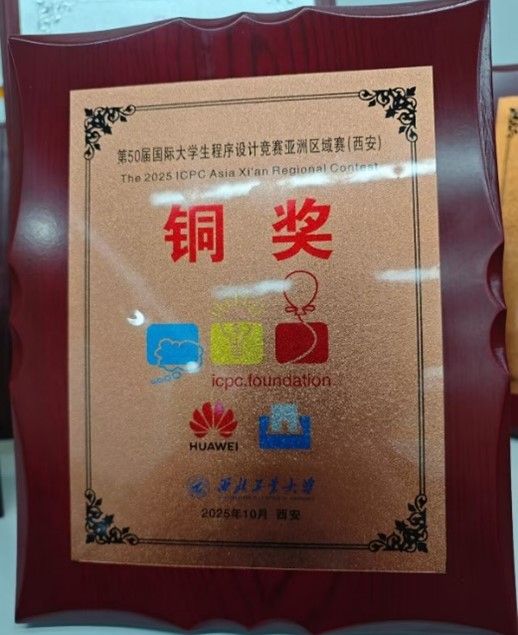 10月19日,在第50届ICPC国际大学生程序设计竞赛亚洲区(西安站)中,由陈瑾、朱哲含与韩宇轩同学组成的队伍,历经5小时激烈角逐,从全国417支队伍中脱颖而出,荣获铜奖。
