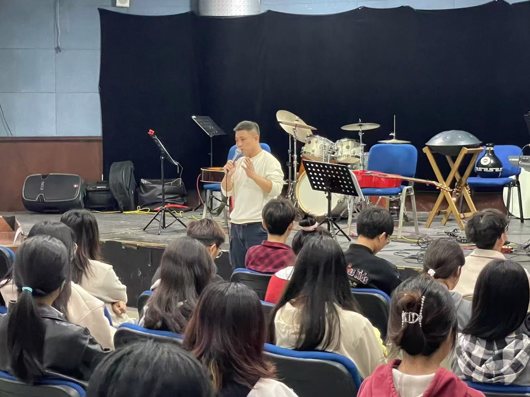 讲座中,乐队为同学们带来了吉他演奏、歌曲演唱以及摇滚弹奏等精彩表演,充分展示了他们对音乐的深厚热爱与独特才华。现场气氛热烈,掌声不断。